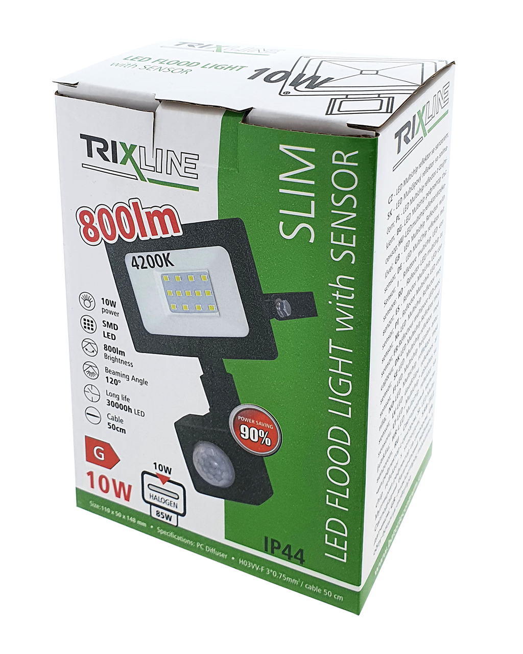 Energiatakarékos halogénlámpa-helyettesítő. Kertben, kocsifelhajtón, garázsban stb. használható lámpa. Az IP44 védettségi szintű reflektor bármilyen irányból fröccsenő vízzel szemben ellenálló.