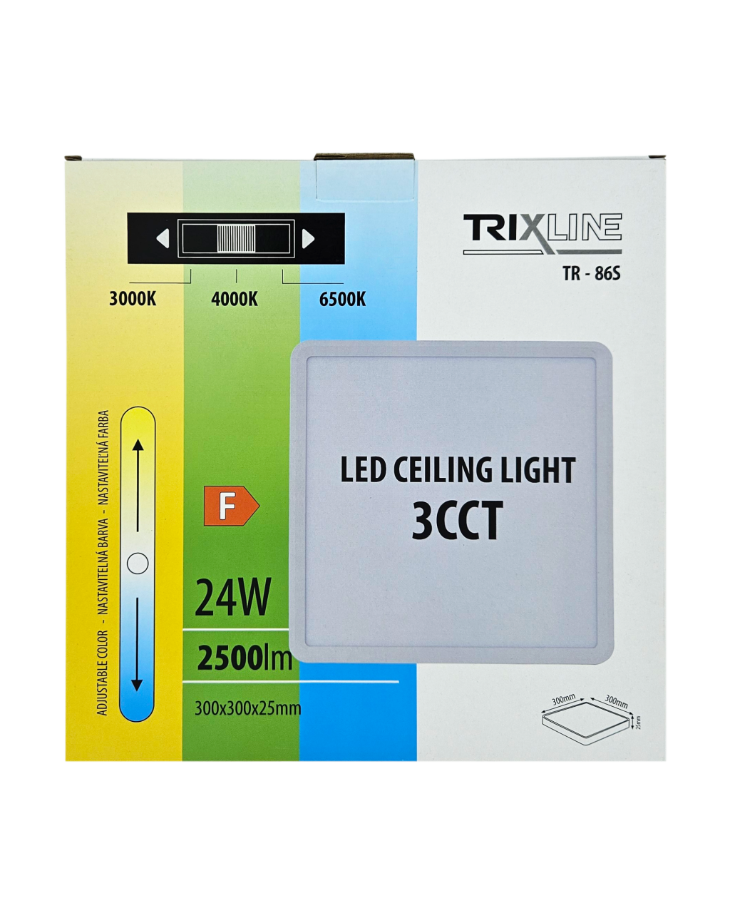 Modern és nagy teljesítményű LED mennyezeti lámpa 3CCT TR-86S Trixline – kiváló minőségű és egyenletes világítást biztosít 2500 lumen teljesítménnyel. Az állítható 3CCT lehetővé teszi meleg, semleges vagy hideg fehér fényszín (3000K/4000K/6500K) kiválasztását a tér hangulatához való optimális alkalmazkodás érdekében. Kellemes és hatékony világítás, amely megfelel az Ön esztétikai és gyakorlati igényeinek.