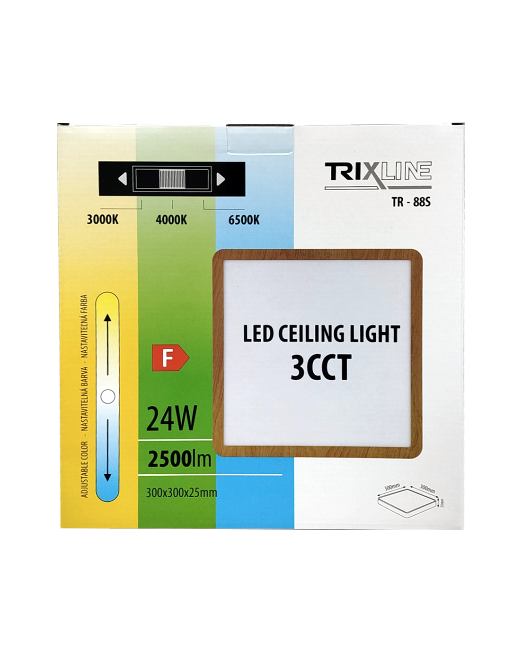 Modern és nagy teljesítményű LED mennyezeti lámpa 3CCT TR-88S Trixline – kiváló minőségű és egyenletes világítást biztosít 2500 lumen teljesítménnyel. Az állítható 3CCT lehetővé teszi meleg, semleges vagy hideg fehér fényszín (3000K/4000K/6500K) kiválasztását a tér hangulatához való optimális alkalmazkodás érdekében. Kellemes és hatékony világítás, amely megfelel az Ön esztétikai és gyakorlati igényeinek.