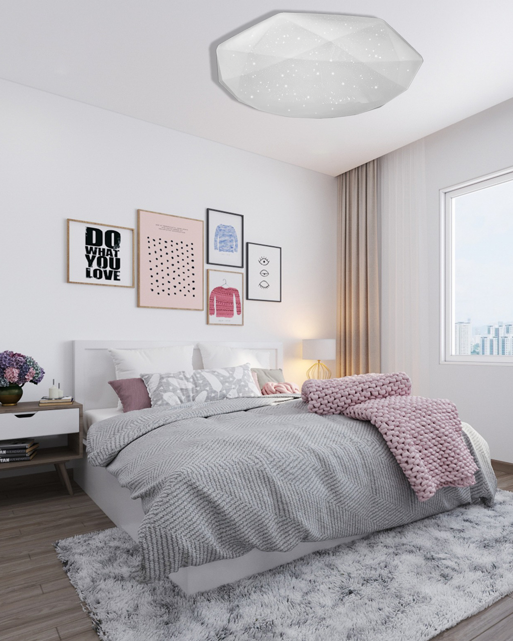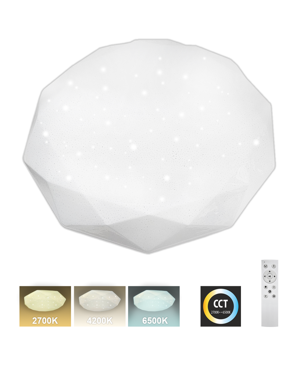 A TR-600C – INDUS Trixline LED mennyezeti lámpa fehér színben, csillogó hatással beltéri helyiségekbe, például nappalikba, hálószobákba, előszobákba, irodákba, folyosókra és hasonló helyekre készült. A mellékelt távirányítóval három fényhőmérséklet közül választhat 2700K és 6500K között, amelyek szükség szerint szabályozhatók a kellemes hangulat megteremtése érdekében. Maximális fényerő-szabályozásnál a fogyasztás az eredeti 60W-ról mindössze 8W-ra csökken, ami energiamegtakarítást garantál. A távirányítón további opciók az éjszakai üzemmód és a 30 másodperces funkció, amely után a LED lámpa magától kikapcsol. A lámpa kikapcsolás után megjegyzi az utoljára beállított üzemmódot, ami kényelmes és intuitív használatot biztosít.