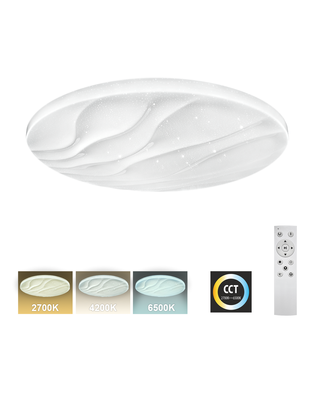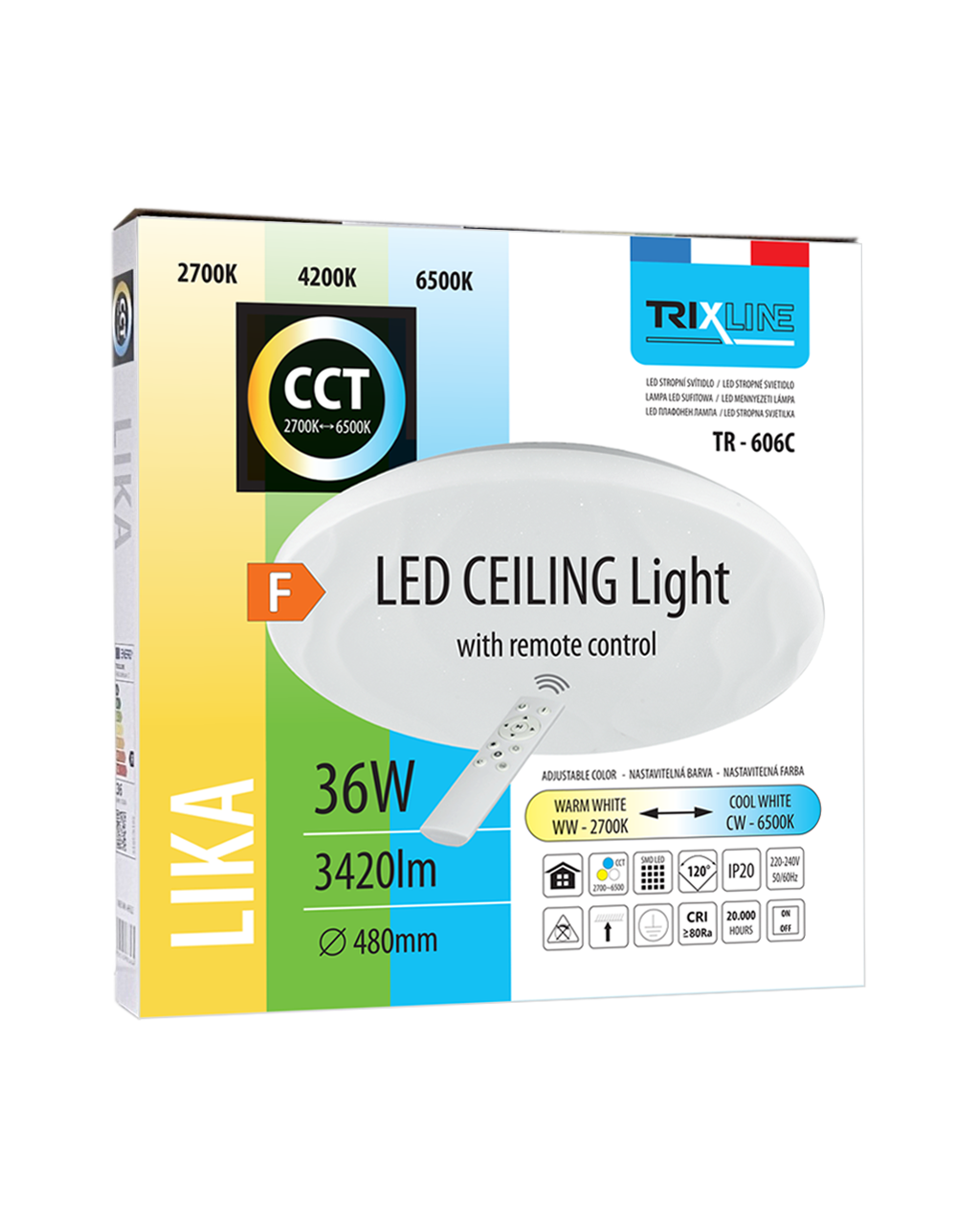 A TR-606C – LIKA Trixline LED mennyezeti lámpa fehér színben, csillogó hatással beltéri helyiségekbe, például nappalikba, hálószobákba, előszobákba, irodákba, folyosókra és hasonló helyekre készült. A mellékelt távirányítóval három fényhőmérséklet között válthat 2700K és 6500K között, amelyek szükség szerint szabályozhatók a kellemes hangulat megteremtése érdekében. Maximális fényerő-szabályozásnál a fogyasztás az eredeti 36 W-ról mindössze 6 W-ra csökken, ami energiamegtakarítást garantál. A távirányítón további opciók az éjszakai üzemmód és a 30 másodperces funkció, amely után a LED lámpa magától kikapcsol. A lámpa kikapcsolás után megjegyzi az utoljára beállított üzemmódot, ami kényelmes és intuitív használatot biztosít.