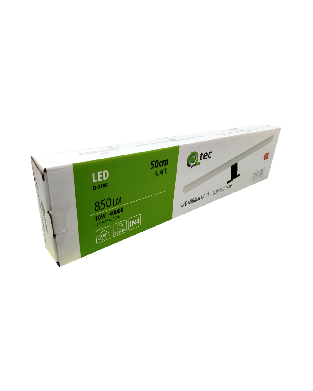 A Q-310B Qtec 10W fürdőszobai fali lámpa előnye a modern dizájn, a minőségi kidolgozás, az IP44 védettségi szint lehetővé teszi a lámpa felhelyezését magas páratartalmú helyiségben, pl. fürdőszobában, valamint a 3 az 1-ben rögzítési módok tükörre, szekrényre vagy falra. A fényforrás energiatakarékos LED-ek, amelyek semleges fehér, 4000K színű, szemnek kellemes fényt bocsátanak ki.