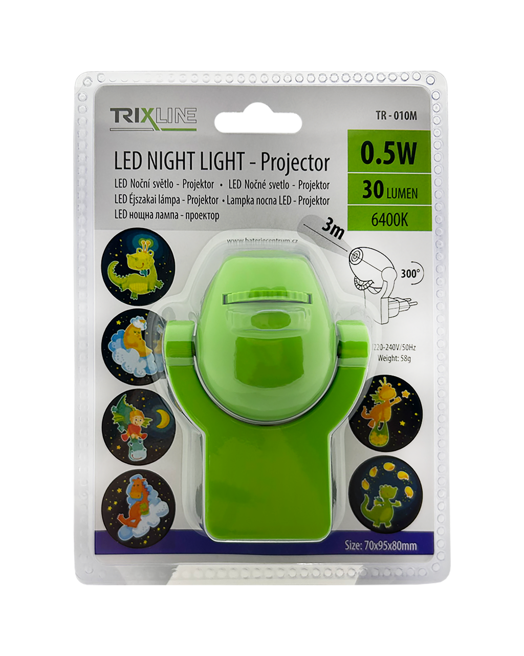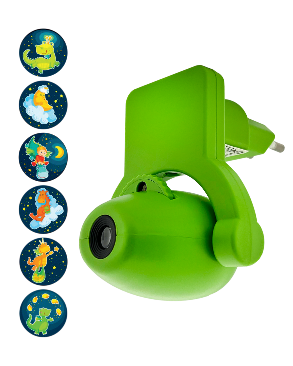 Varázsolj varázslatot gyermeked szobájába projektorfoglalatvilágításunkkal! 0,5 W-os **energiafogyasztásával** energiatakarékos, **és** egy **szürkületérzékelővel** is fel van szerelve, amely sötétben automatikusan bekapcsolja a lámpát. A zöld projektor **hat manuálisan kiválasztható képet** vetít a falra vagy a mennyezetre, varázslatos hangulatot teremtve. Ideális éjszakai fény a nyugodt alváshoz és az álomszerű kalandokhoz!
