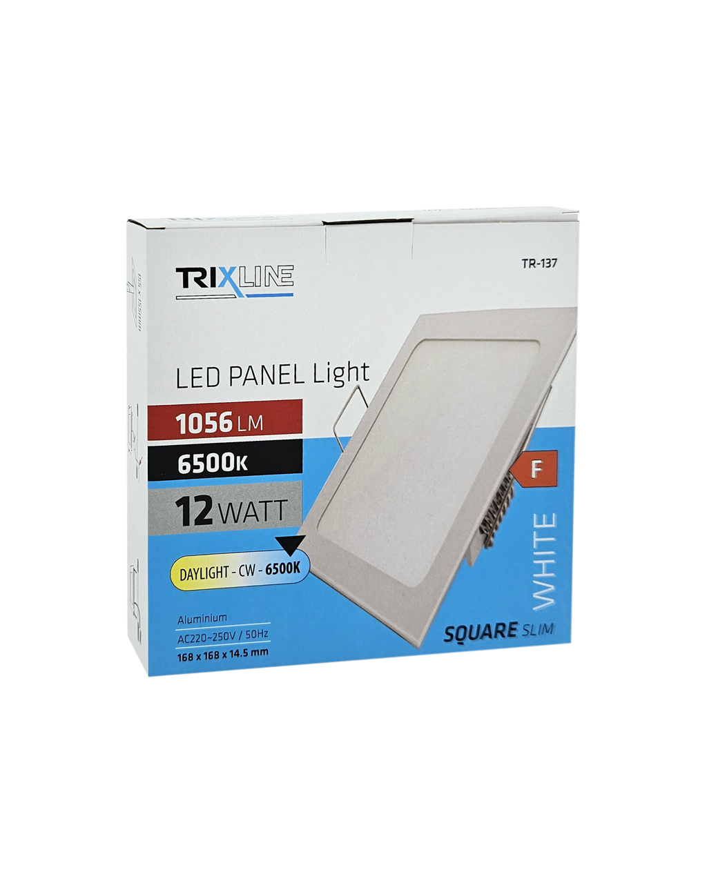 Négyzet alakú, süllyesztett LED panel Trixline TR-137, 12W teljesítménnyel, 1056lm fényárammal és 6500K hideg fehér fényszínnel. A panel kiváló minőségű alumíniumból készült. A felhasznált LED technológiának köszönhetően akár 85%-os energiamegtakarítást is elérhet. Beltéri használatra tervezték, gipszkartonba süllyeszthető, 15,3×15,3 cm-es rögzítőfurattal. A lámpa külső méretei 16,8×16,8×1,45 cm. Gyors és egyszerű telepítés. Előnyök: Ideális gipszkartonba szereléshez Energiatakarékos LED technológiát használ Akár 50 000 óra élettartam 1/40