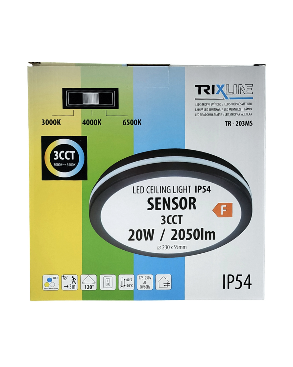 A modern és nagy teljesítményű LED CCT mennyezeti lámpa TR-203MS Trixline – mozgásérzékelővel – kiváló minőségű és egyenletes világítást biztosít 2050 lumen teljesítménnyel. Az állítható CCT lehetővé teszi a meleg, semleges vagy hideg fehér fényszín (3000K/4000K/6500K) kiválasztását a szoba hangulatának optimális beállításához. Kellemes és hatékony világítás, amely megfelel az Ön esztétikai és gyakorlati igényeinek. A fény hőmérséklete a hátulján található fedél alatt egy csúszkával állítható. A lámpa mozgásérzékelővel van felszerelve, amely automatikusan bekapcsolja a lámpát mozgás érzékelésekor. A lámpa univerzális tulajdonságainak és IP54-es védettségének köszönhetően különböző helyekre felszerelhető, amely védelmet nyújt a por és a fröccsenő víz ellen.